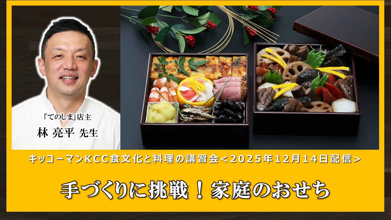 2025年12月14日KCC食文化と料理の講習会は、「てのしま」店主の林亮平先生をお招きし、「手づくりに挑戦!家庭のおせち」をテーマに開催しました。