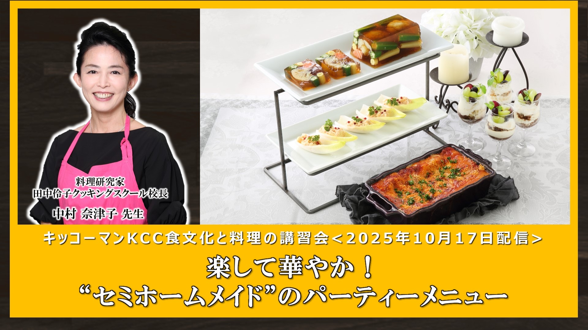 2025年10月17日KCC食文化と料理の講習会は、料理研究家、田中伶子クッキングスクール校長の中村奈津子先生をお招きし、「楽して華やか!“セミホームメイド”のパーティーメニュー」をテーマに開催しました。