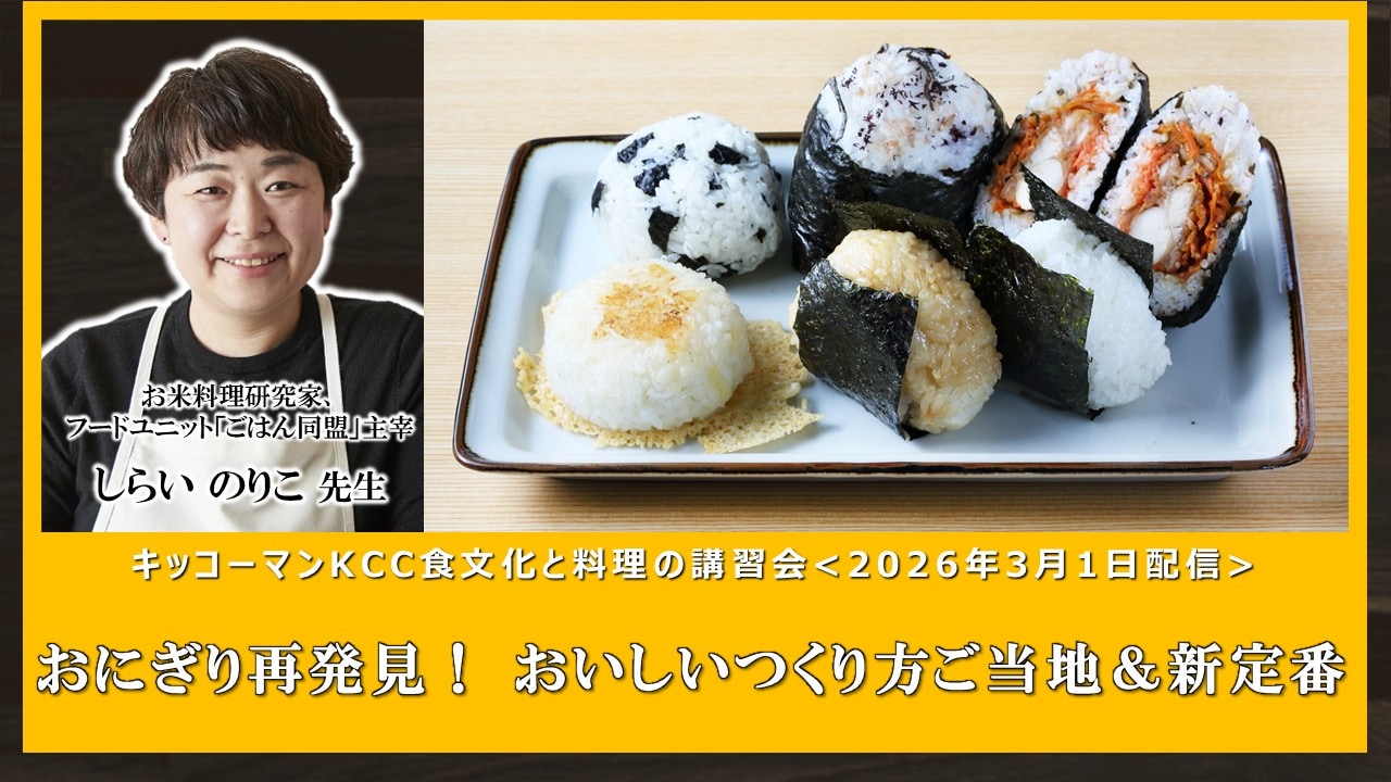 2026年3月1日KCC食文化と料理の講習会は、お米料理研究家、フードユニット「ごはん同盟」主宰のしらいのりこ先生をお招きし、「おにぎり再発見! おいしいつくり方 ご当地&新定番」をテーマに開催しました。