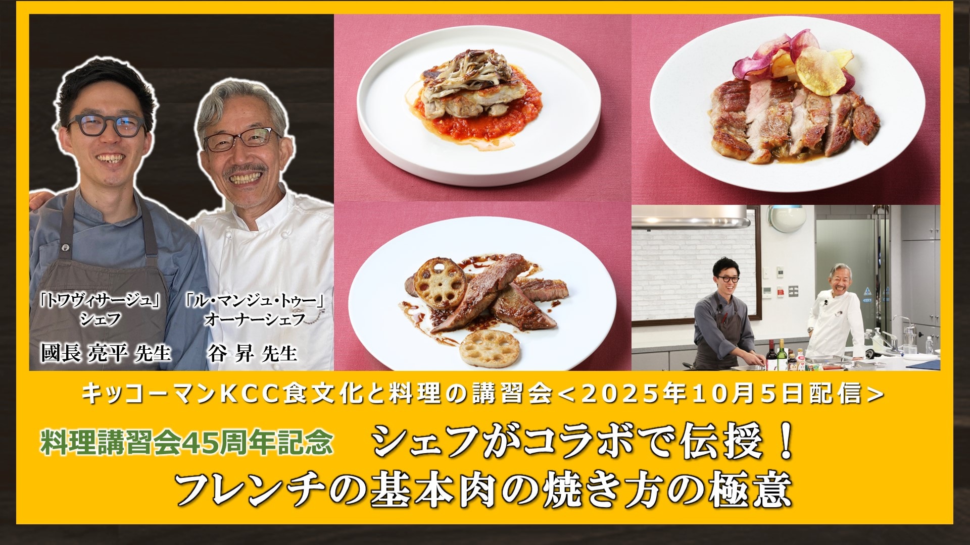 2025年10月5日KCC食文化と料理の講習会は45周年を記念して「ル・マンジュ・トゥー」オーナーシェフの谷昇先生と「トワヴィサージュ」シェフの國長亮平先生をお招きし、「シェフがコラボで伝授!フレンチの基本 肉の焼き方の極意」をテーマに開催しました。
