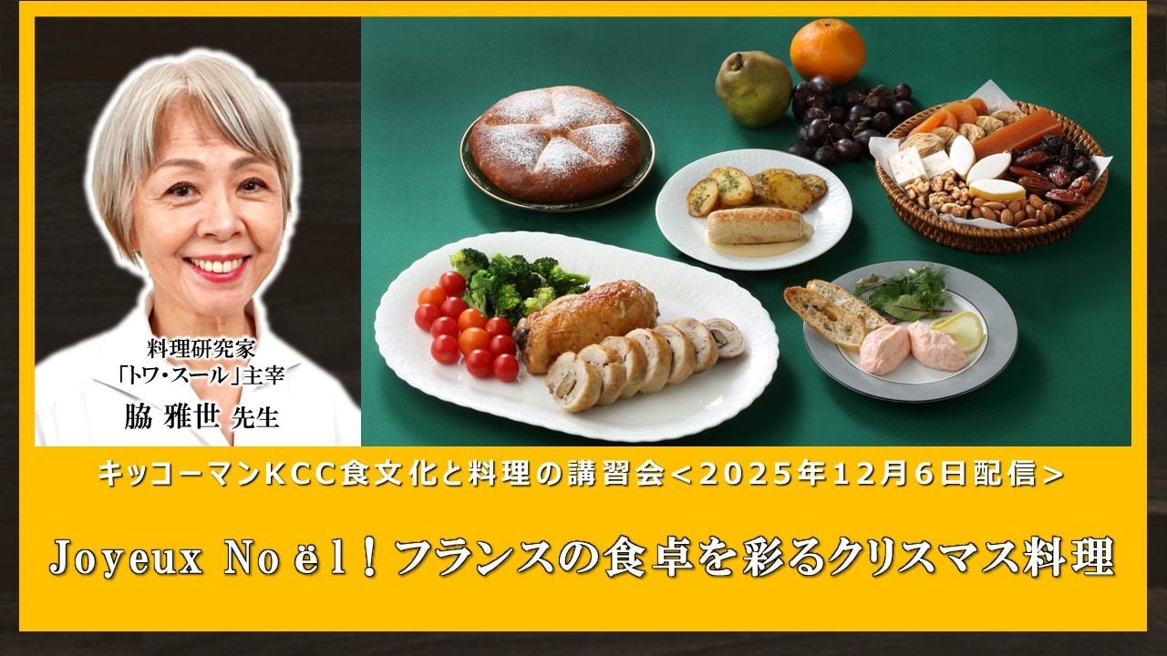 2025年12月6日KCC食文化と料理の講習会は、料理研究家、トワ・スール主宰の脇雅世先生をお招きし、「Joyeux Noël!フランスの食卓を彩るクリスマス料理」をテーマに開催しました。