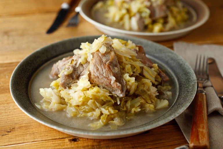 「シュークルート」というフランス・アルザス地方の名物料理で、酸味のある発酵キャベツと豚肉を白ワインで煮込みます。豚肉の下味にしょうゆをもみ込むと全体のコクがアップ。