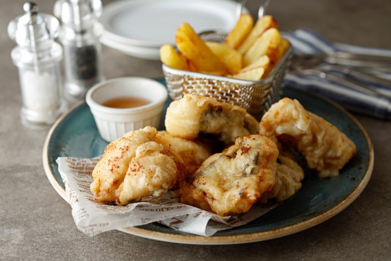 白身魚のフライとフライドポテト(チップス)を盛り合わせた、イギリス生まれの定番国民食。しょうゆを下味にきかせるひと工夫で、魚のうまみがぐっと引き立ち、よりおいしく。