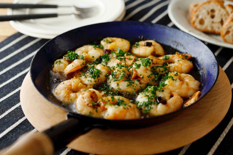 スペインの「バル」で提供される、オリーブオイルでぐつぐつと炒め煮にした定番料理。えびにしょうゆをもみ込むひと工夫で、ほんのり塩けが入り、くさみもすっきりしておいしさが際立ちます。