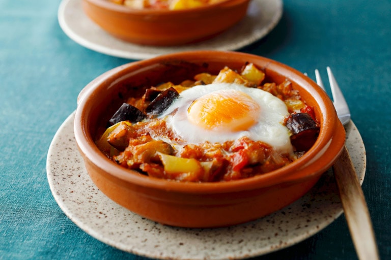 フラメンコのダンサーの衣装のような見た目が由来とされる、スペイン・アンダルシア地方の郷土料理。しょうゆを2度に分けて加えて、野菜にもトマトソースにもうまみをプラス。