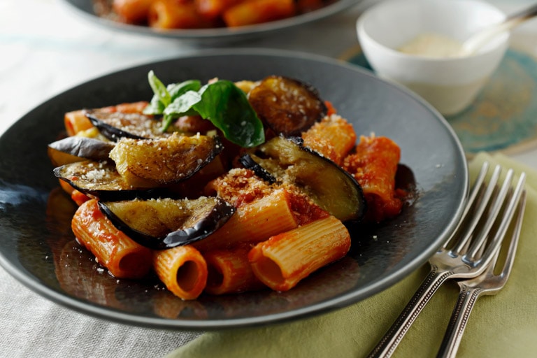 イタリア・シチリア島のカターニア地方を発祥とする、トマトとなすを使った伝統的なパスタ。トマトと相性のいいしょうゆを加えれば、うまみの相乗効果で味わいがぐっと深く。