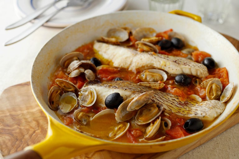 イタリア・ナポリ発祥の白身魚や貝類、トマト、にんにく、オリーブに水を加えて煮込み、魚介のうまみをシンプルに味わう料理。鯛の下味にしょうゆを使い、味わいをすっきり。