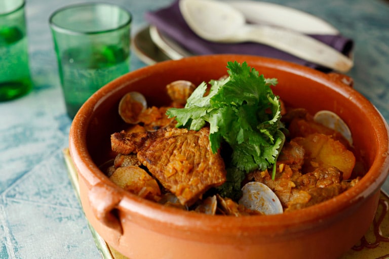 ポルトガル南部、アレンテージョ地方のごちそう感のある郷土料理。豚肉とあさりから出るうまみを、揚げ焼きにしたじゃがいもがしっかり受け止めます。しょうゆのうまみを加えることで、全体の深みが一段と。