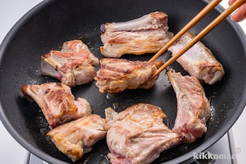 フライパンに油を中火で熱し、豚スペアリブを入れて表面に焼き色がつくまで焼く。