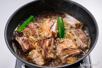 余分な油をキッチンペーパーで拭き取り、酒と水1と1/2カップを加えて強火で煮る。アクを取り、にんにく、しょうが、赤唐辛子、(A)とねぎを加え、落としぶたをして弱火で30分煮る。途中、煮汁が減ったら適宜水をたす。