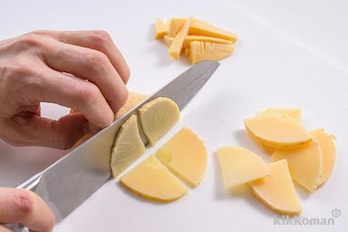 たけのこは、穂先は3cm長さの薄切りにし、根元は縦4等分に切ってから、横に薄切りにする(いちょう切り)。油揚げは熱湯をかけて油抜きし、縦半分に切ってから5mm幅の細切りにする。