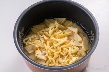 炊飯器に米と白だしを入れて3合の目盛りまで水を加えて軽く混ぜ、(2)のたけのこ、油揚げをのせて炊飯する。炊き上がったら全体を混ぜて器に盛り、好みで木の芽を添える。