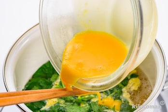 三つ葉、しょうゆ、塩を加え、すぐに卵液を菜箸に伝わせながら、なるべく細く回し入れる。ふわっと半熟状になったら火を止める。