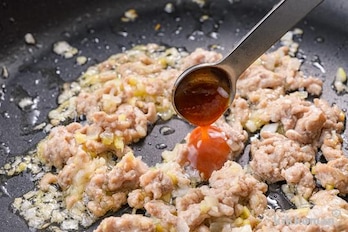 フライパンにサラダ油を中火で熱し、ひき肉、にんにく、しょうが、ねぎを炒め、香りが出たら、豆板醤を加えてさらに炒める。