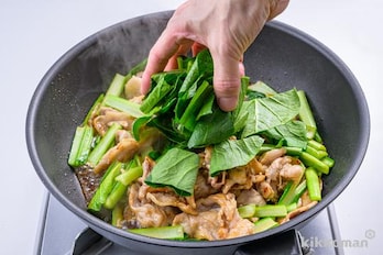 フライパンにごま油を入れて熱し、(2)の豚肉を強火で炒める。火が通ったら小松菜の茎を加え、1分ほど炒める。(B)を加えて30秒ほど炒め、小松菜の葉を加えてさっと炒める。