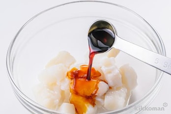いかは解凍して、表面に5mm間隔の格子状に浅く切り込みを入れてから2cm角に切る。ボウルに入れて、(A)で下味をつける。