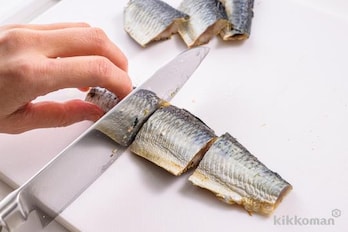 米のとぎ汁を捨てて再び並べ、熱湯を回しかけてそのまま冷ます。よく水洗いをして、頭と尾を切り落とし、5cm長さに切る。