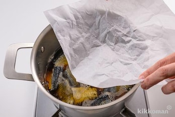 鍋に(A)を合わせてひと煮立ちさせ、にしんを入れ、オーブンシート(クッキングシート)で落としぶたをして中火で2~3分煮る。