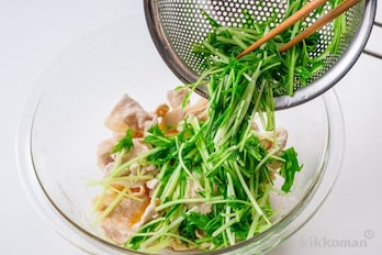 ボウルに(A)を合わせ、豚肉、水菜を加えて和える。器に盛り、ごまを散らす。