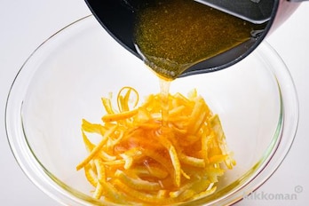 清潔なボウルに果汁を絞り、残ったゆずは繊維を断つように、ごく薄い薄切りにして、果汁に加える。