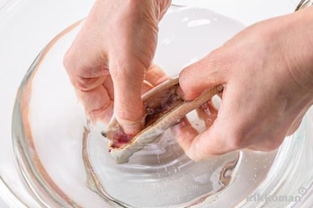 いわしはうろこを取り、頭を切り落とし、内臓を取り除いてきれいに洗う。
