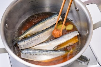 鍋に(A)を合わせて中火にかけ、煮立ったらいわしを並べ入れる。梅干し、しょうがを加える。