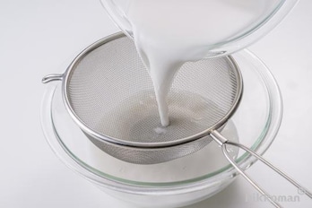 ボウルにくず粉を入れて、水3カップを少しずつ加えてダマがなくなるまで泡立て器で混ぜ、こす。