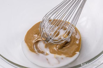 別のボウルに練りごまを入れ、(1)を少しずつ(最初は大さじ1くらいずつ)加えて溶きのばし、塩、酒を加えて混ぜる。