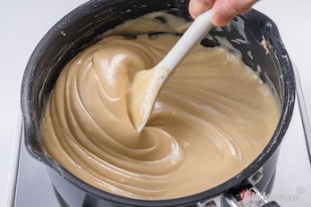 (2)を鍋に移し、へらで絶えず混ぜながら、中火で20分ほど煮詰める。