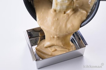 流し箱を水でぬらして(3)を流し入れる。数回落として空気を抜き、粗熱を取り、ラップをかけて冷蔵庫で冷やし固める。