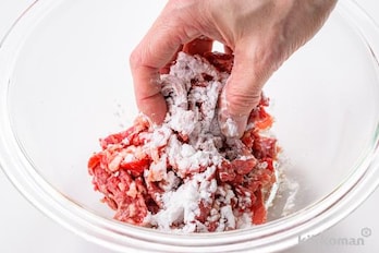 牛肉は6~7mm幅の細切りにしてボウルに入れ、(A)をふって軽くもんで5分おき、片栗粉をまぶす。