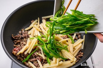 フライパンにサラダ油を中火で熱し、しょうがを炒め、香りが出たら牛肉を加える。肉の色が変わってきたら、たけのこ、ピーマンを加えて炒め、火を通す。