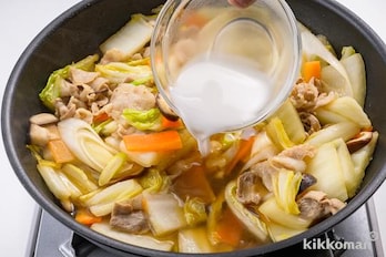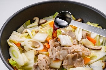 全体に火が通ったら水200mlとしょうゆを加え、全体を混ぜ合わせ、ひと煮立ちさせる。