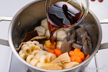 素材を飾り切りにする。しいたけは水でもどして、亀甲切りにする。里芋は六方にむき、塩(分量外)でぬめりを取り、洗い流す。平らな面にV字に切り込みを入れ、両側面から切り込みに向かって包丁を入れる(鶴の形に飾り切りにする)。こんにゃくは5mm厚さに切り、手綱こんにゃくにする。れんこんは花形にして、1cm厚さに切り水にさらす。にんじんは1.5cm厚さに切って花形に抜く。