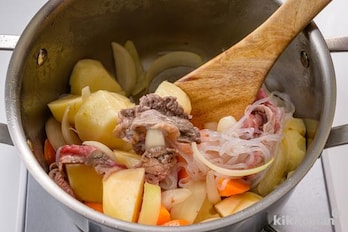 鍋に油を中火で熱し、玉ねぎを炒め、牛肉を加えてさらに炒める。にんじん、じゃがいも、しらたきを加えて炒め合わせる。