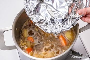 かつおだしを加え、沸騰したらアクを取り、しょうゆ、みりんを加えて落としぶたをする。沸騰したら弱火にして15分ほど煮る。