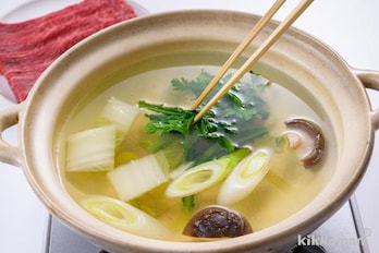 しいたけは石づきを切り半分に切る、または好みで飾り切りにする。白菜、春菊はザク切り、ねぎは斜め薄切りにする。牛肉は大きければ食べやすい大きさに切る。