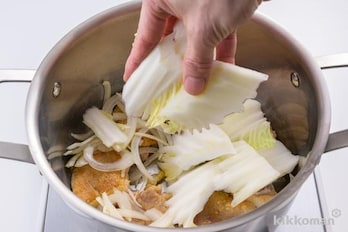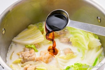 (A)を加えて煮立ったら弱火にし、ふたをして8分ほど煮る。白菜の葉、牛乳、しょうゆを加え、葉がしんなりするまで煮る。(B)の水溶き片栗粉をよく混ぜてから少しずつ加え、とろみをつける。