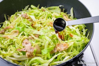 フライパンに油小さじ1を入れて熱し、(1)のキャベツ、豚肉を強めの中火で3~4分炒め、しょうゆを回しかけて汁けをとばし、いったん取り出す。