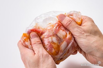 ポリ袋に豚肉、(A)を入れて、もみ込み、下味をつける。