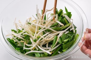 にらは3cm長さに切り、もやしといっしょにボウルに入れ、ごま油を加えて全体に和える。(B)は合わせておく。