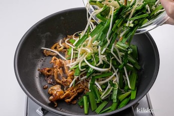 フライパンを熱して、豚肉を炒め、(B)を加えて炒めからめる。にら、もやしを加え、ざっと炒め合わせる。