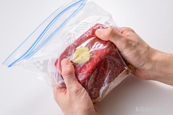 牛肉にフォークで数か所穴を開け、(1)の保存袋に入れる。塩、こしょう、オリーブオイル大さじ1を加えてよくもみ込み、袋の空気をしっかりと抜き、口を閉じて室温で15分ほどおく。