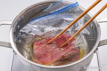 鍋にたっぷりの湯を沸かし、(2)を保存袋ごと入れ、中火で2分ほど牛肉の全体が白っぽくなるまでゆでる。火を止め、ふたをしてそのまま20分ほどおく。