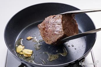 保存袋からにんにくを取り出してフライパンに入れ、オリーブオイル大さじ1/2を加えて弱火にかける(保存袋に残った肉汁はとっておく)。にんにくの香りが立ったら、牛肉を入れて中火で転がしながら全体にしっかりと焼き色をつける。