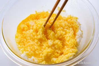 ボウルにご飯、油大さじ1を入れ、しゃもじなどでご飯をほぐす。(1)の卵液を加え、菜箸でしっかりほぐしながら混ぜる。