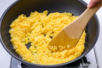 フライパンに油大さじ1を強火で熱し、十分に温まったら中火にし、(2)を入れて木べらなどでを全体に広げる。ご飯をつぶさないよう、木べらを寝かせて小刻みに動かすようにして炒める。途中、木べらで上下を返す(あおらずに、木べらで上下を返すようにするとよい)。