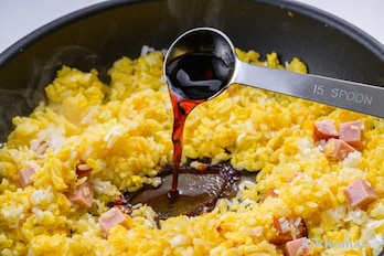 4~5分炒め、ご飯がパラパラしてきたら、ねぎ、焼豚を加えて炒め合わせる。全体が混ざったらいったん火を止め、フライパンの中央をあけ、そこにしょうゆを加える。