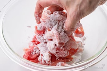 (1)のボウルに片栗粉を加えて、豚肉にまぶす。フライパンに油を中火で熱し、豚肉を広げ入れ、両面に焼き色がつくまで焼く。