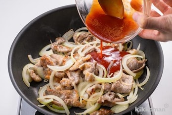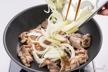 玉ねぎを加え、豚肉に火を通しながらしんなりするまで2~3分炒める。